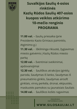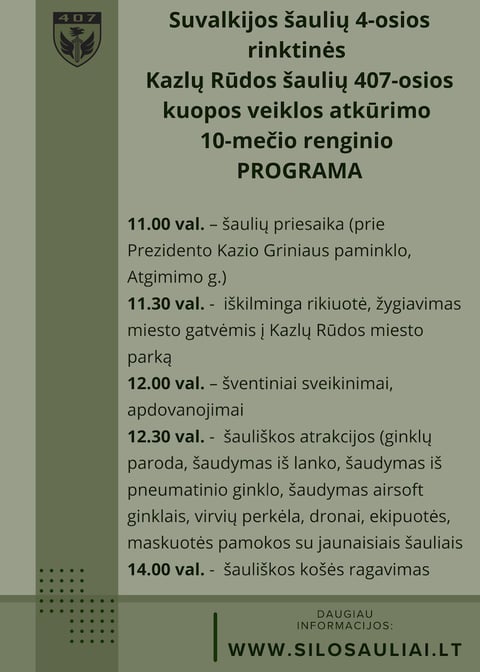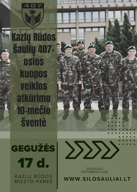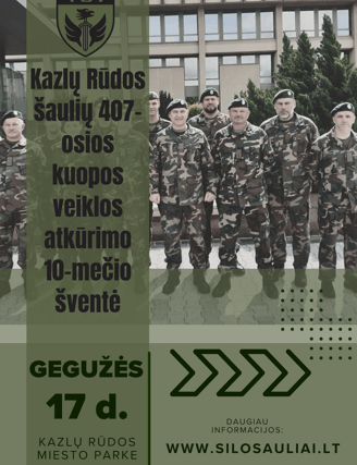Gegužės 17 dieną kviečiame visus Kazlų Rūdos gyventojus ir svečius dalyvauti iškilmingame Suvalkijos šaulių 4-osios rinktinės Kazlų Rūdos šaulių 407-osios kuopos veiklos atkūrimo 10-mečio renginyje.